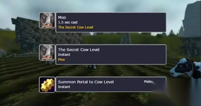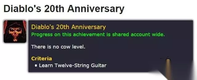 暗黑20周年庆成就 从现有的数据结果出发,玩家们发现似乎暴雪最喜欢的一个彩蛋 - 奶牛关 - 将会以某种形式进入到魔兽世界,有可能玩家将会通过秘密奶牛关的形式拿到这些20周年纪念装备。