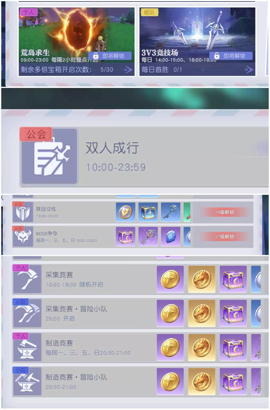全是各种时间限制的模式内容,在奖励匮乏的情况下,就连获得最基础的免费奖励也是相当的麻烦,而且明显能发现所有活动获得的奖励没有太多区别,也呈现出了获得的种类并没有太多具有利用价值的特点表现。