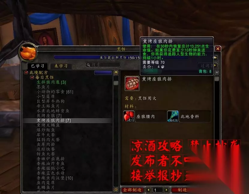 这里我一定要说一个特别好的道具,叫做“熏烤座狼肉排”,如下图所示,这个食物是诺森德食物,出售的NPC在诺森德的达拉然的阵营旅馆的厨师,注意是阵营旅馆,不要去中间的中立魔术旅馆,需要美食家勋章这种货币,可以每天做每日任务拿到3个左右。