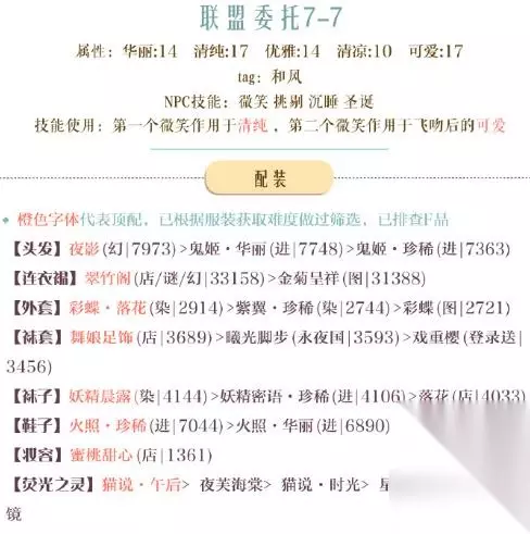 联盟委托7-7攻略 属性:华丽:14 清纯:17 活泼:14 清凉:10 可爱:17 tag:和风