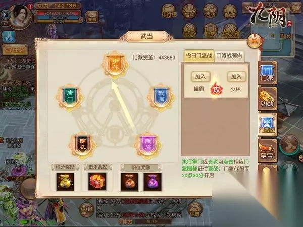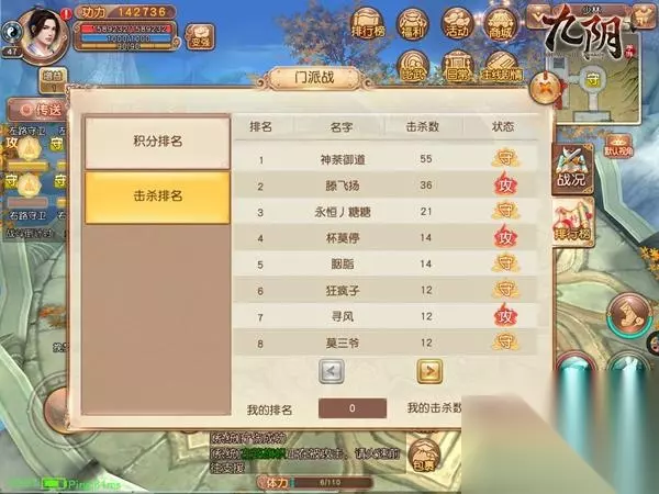 3、选阵营有技巧 当前门派战中胜败与否的奖励相对于击杀榜的奖励略逊一筹,这时玩家要着重拿去击杀榜的奖励,尽量要选择人数较少的门派进行参战,一是可以拥有人数平衡的BUFF增益,二是面对大量敌人,可以不断冲入敌阵去击杀敌人。如果玩家选择了优势门派进行参战,那狼多肉少的局面在所难免,除非运气逆天拿到了较多击杀或者土豪玩家,否则进入击杀榜前十难度很大。