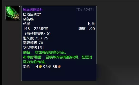 属性介绍 这个史诗级装备的造型比较奇特,被玩家赋予一种蛋盾的名称。 绑定之后可以带来82点护甲、205点格挡、4点力量、6点耐力、4点躲闪。 埃辛诺斯碎片有什么用 1、埃辛诺斯碎片是游戏中的一种武器,使用时能概率性召唤埃辛诺斯的灰烬。 2、在黑暗神殿里和其他玩家一起挑战这个25人团队副本时,击败BOSS掉落的。