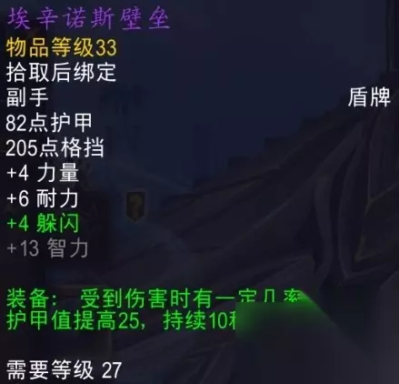 魔兽世界埃辛诺斯壁垒在游戏中是属于T6级别的强力盾牌,佩戴之后当你受伤的时候可以让你的护甲值提升25,并持续10秒时间,击败黑暗神殿副本中的最终BOSS就可以获取这个盾牌了。