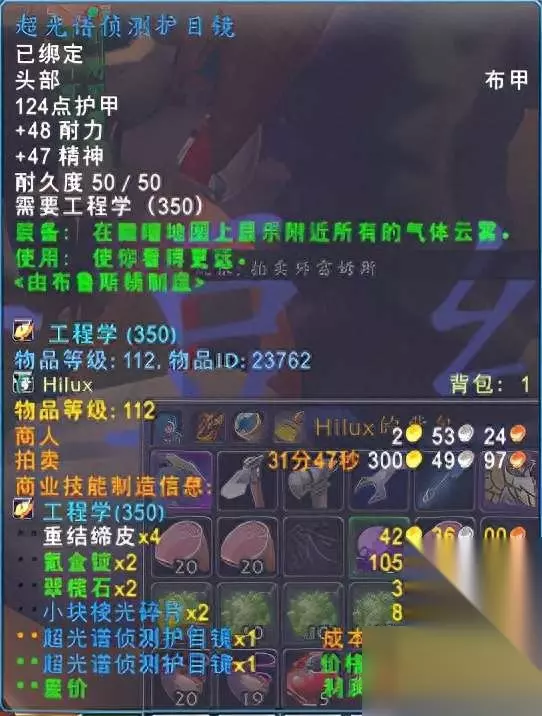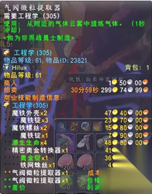 我们区现在结缔皮碎片30Y一张 结缔皮1.5G一张,厚裂蹄牛皮14G一张,空气微粒7G左右。 为什么要搭配工程呢,因为工程有个唯一可以赚钱的神器:“气阀微粒提取器”。当然需要配合一个:“超光谱侦测护目镜”。(这是最便宜的探测器了!)