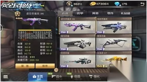 6.虚空恶魔 上榜理由:被禁赛的神器。虚空恶魔是一把高科技武器,VIP3以上可以购买,售价6880钻石。虚空恶魔有着M系武器的射速100,和98的稳定。A系武器的杀伤32。虚空恶魔上手极快,所以也被各大比赛禁用,是一把不可多得的禁赛神器。