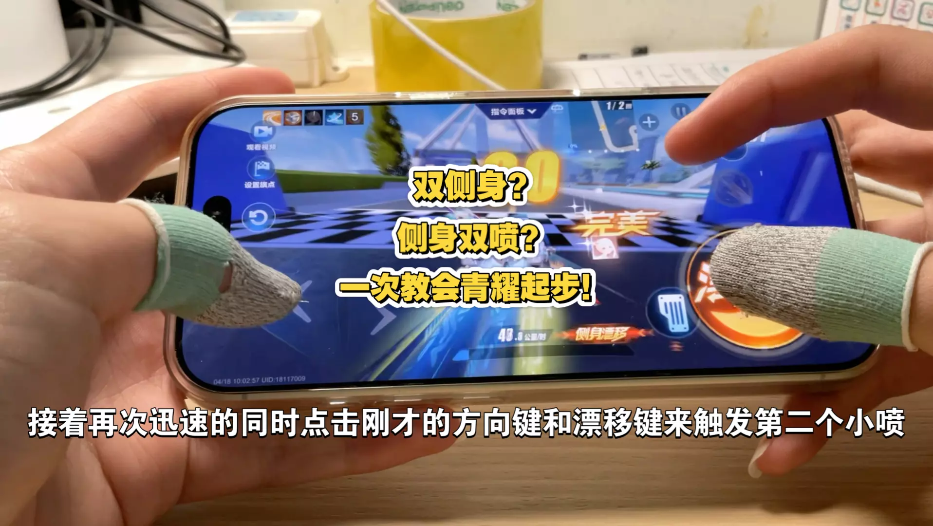 这是QQ飞车手游的技巧教学内容,针对不会三指操作的玩家,带来两指侧身双喷的教学,还展示了侧身双喷在赛道中的实际应用,帮助玩家掌握该技巧提升赛道表现。