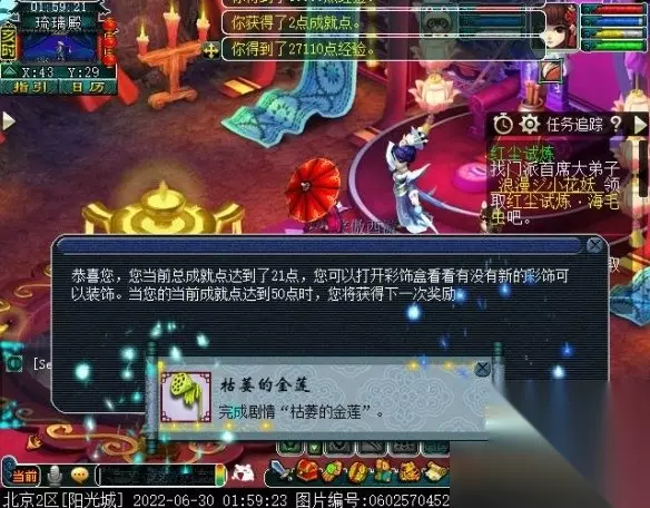 4、完成这个任务之后,小伙伴们就可以直接获取到游戏中的枯萎的金莲了。 5、获取之后,小伙伴们就可以直接在自己的行囊中找到属于自己的枯萎的金莲了。