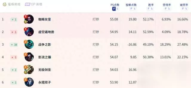 目前强度在线的打野行列上可以看到除了蜘蛛外,其他全是清一色的AD型打野英雄,蜘蛛已经成为了一股清流。