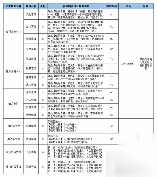 WLK怀旧服:一图了解铭文专业的卡牌产品,暗月套牌效果很好很强大 WLK新推出的铭文专业很强大,除了能够制作各职业的技能强化铭文外,还能制作一些可以换装备的卡牌。除了原来TBC阶段世界掉落的八种卡牌外,还新增了10级、20级、30级、40级和80级的系列卡牌。具体如下图: