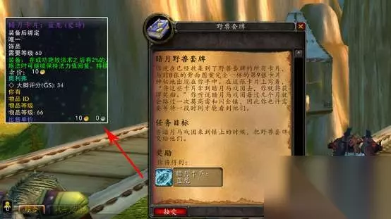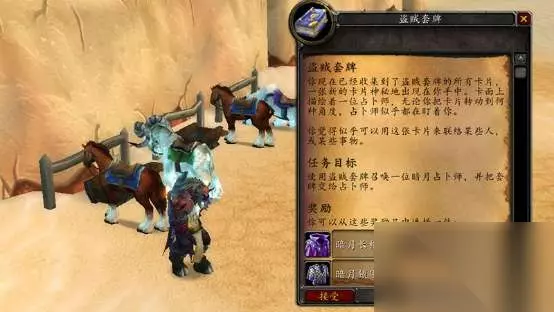 04暗月套牌(督军/入口/野兽/元素) 由铭文技能“暗月卡片”制作,需要【重羊皮纸】*1+【苍穹墨水】*5+【闪光墨水】*2,使用技能后会随机给予督军/入口/野兽/元素套牌中的某一张,每种共八张,要收集齐全不太容易。集齐后合成对应的套牌,右击使用可以接到任务,需要在暗月马戏团开放时去营地交任务换装备,都是紫色装备,使用等级60级。 【督军套牌】可以换饰品【暗月卡牌:英雄】,装备效果是“在攻击敌人时有可能给使用者回复120至180点生命值”,适合攻速较快的物理输出职业如盗贼、猎人。