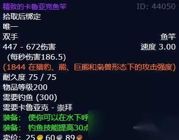 精致的卡鲁亚克鱼竿信息 447 - 672伤害 (每秒伤害186.5) (1844 在猎豹、熊、巨熊和枭兽形态下的攻击强度) 速度 3.00 耐久度 75 / 75 物品等级200 需要钓鱼 (300) 需要卡鲁亚克 - 崇拜 装备: 使你可以在水下呼吸。 装备: 钓鱼技能提高30点。