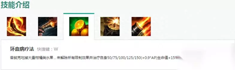 W技能:解除所有限制效果并治疗自身50/75/100/125/150(+0.9AP)生命值+15%的已损失生命值,这个是目前LOL为数不多可以称之为神技之一,橘子前期一般只点一级,相当于22秒一个能够恢复血量的水银饰带!并且血量越低恢复的越多,所以尽量在低血量时用W,猛地恢复一大口,往往能够起到出其不意的反杀!