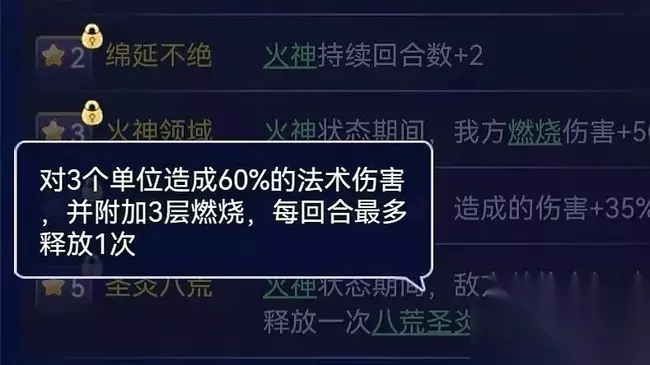 火神 攻击时附加4层燃烧状态 八荒圣炎 对3个单位造成60%的法术伤害 并附加3层燃烧,每回合最多释放1次