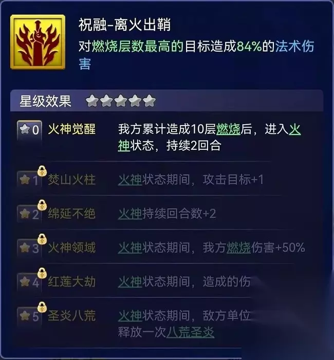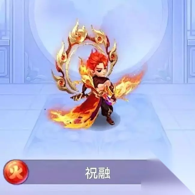 焚山火柱: 火神状态期间,攻击目标+1 关键技能,进入火神状态后从单秒变为秒2,弥补了攻击数量上的缺陷。 绵延不绝: 火神持续回合数+2 火神回合数增加,但同时也对整个阵容要求更高,尽量在第一回合可以使对战方被叠加至少10层燃烧,方可发挥最大效果。 火神领域: 火神状态期间 我方燃烧伤害+50% 多层燃烧的伤害得到大幅增加,在某些特殊玩法中,燃烧可能会成为主要的伤害来源。 红莲大劫: 火神状态期间 造成的伤害+35% 基础伤害得到增强。 圣炎八荒: 火神状态期间 敌方单位离场时会释放一次八荒圣炎 升至五星,激活大招八荒圣炎,有敌方单位被击飞时可触发一次60%法术伤害的秒3,并附加3层燃烧,有点类似于牛魔王的爆炸。 作为自金翼后第二个进场的燃烧流金色伙伴,祝融弥补了燃烧流中单秒伙伴的空缺,先不看技能,光看帅气的造型大家愿意给他打几分? 祝融的单秒系数高达84%,光看描述的话是现有单秒伙伴中最高的。 弊端在于想要发挥祝融的技能效果必须搭配其他燃烧伙伴,触发“火神”状态。 因此在常规的战斗中祝融的出场率可能较不如我们常用的如北海龙女、嫦娥仙子、执音等单体伙伴,但在有效的组合下,祝融还是非常强大的。