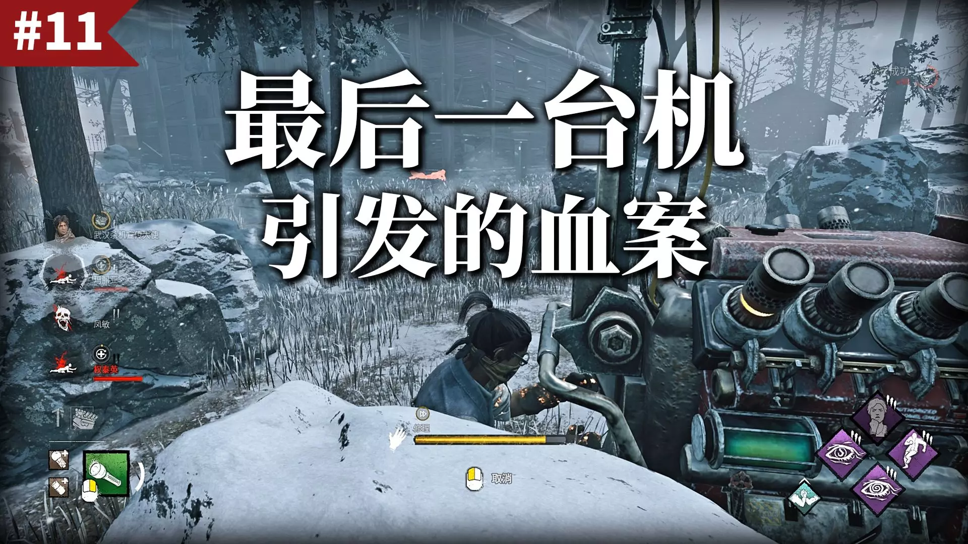 这是《黎明杀机》沉浸式游戏内容,展示了玩家进行电机修理、队友治疗、躲避追杀等游戏过程,玩家在这局游戏中十分想念技能钢筋铁骨。