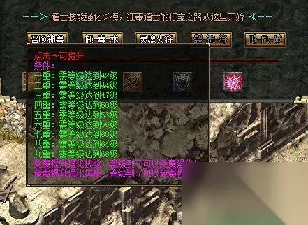 在地魔大师这里,道士能学习的技能一共有10个,其中召唤神兽是免费升级的,不同等级召唤出来的神兽有不同的外型跟攻击里,下面五个技能是要材料来学习的。我们先一个个技能来介绍。 神兽强化:免费学习