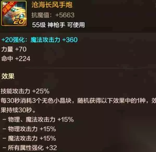 一、T0级:巅峰之选 沧海手炮: 终极毕业武器!每30秒消耗3个无色小晶块,随机获得持续30秒的强力效果:物理/魔法攻击力+15%、或全属性强化+32。直接提升25%技能攻击力,是目前版本最强选择。
