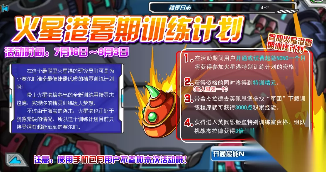 想要获得和参加火星港暑假特训计划,需要在7月16日到9月3日之间,充值一个月的超能NONO获得特训精元才能参加。每人仅限一只,有杰拉德以后,带着杰拉德去英佩恩堡垒找“军团”下载训练程序就可获得2000点积累经验。