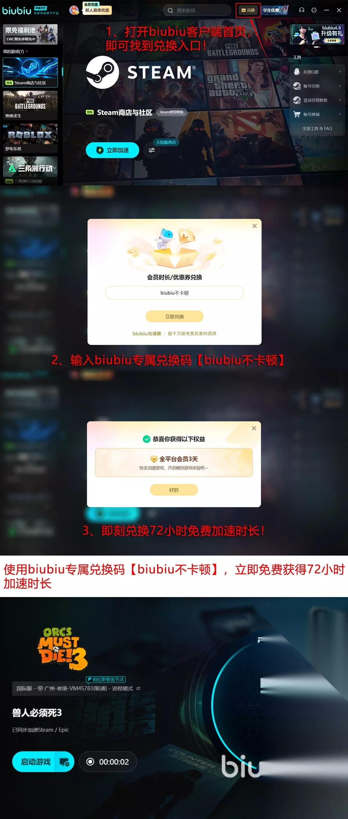 而且对于新用户,平台也提供了诸多福利,首次注册能够拥有24小时全平台免费试用权限,没有任何的限制,另外平台所有用户凭借兑换码【biubiu不卡顿】也是能再额外领取72小时的免费优化时间,在此期间平台内的所有游戏大家都是可以一键优化的,能能够让大家充分的感觉到丝滑顺畅的网络体验服务。