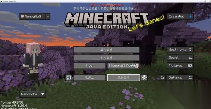 游戏主菜单 因为模组的选项卡是深黑色的,所以接下来讲解我会用左上深黑、左下深黑…等直接讲解(懒得扣字了) 左上(RemoyQwQ):是自己的用户名,正版登录自动连接Essential服务器,并且支持一键添加账户,便于切换。 左下(Wardrobe):服饰库,可以在这里自定义自己的皮肤,例如一键切换披风,类似于基岩版的皮肤编辑器,不过编辑皮肤需要Essential Coins,初次使用送500点数。