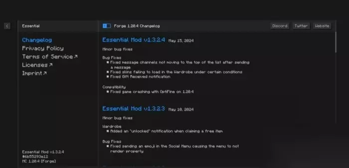 《我的世界Minecraft》Essentials模组联机教程 Essential is a quality of life mod that boosts Minecraft Java to the next level. Essential是一款简易的联机MOD,他破除了传统局域网加lanserverproperties的模组局限性,是一个功能非常强大的模组,正如他介绍中说的那样,提升Java版Minecraft的生活质量,废话不多说,直接进入正题 前置准备 Essential支持Fabric、Forge和安装器安装,安装前先确定好自己的MC使用了什么模组安装器,一般在下载的时候会让你选择。 现在官网Fabric最新版已经支持1.20.6版本,Forge版最新支持1.20.4,根据自己的需要下载对应的版本,下面以Forge1.20.4版本举例