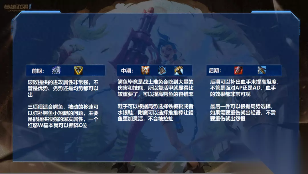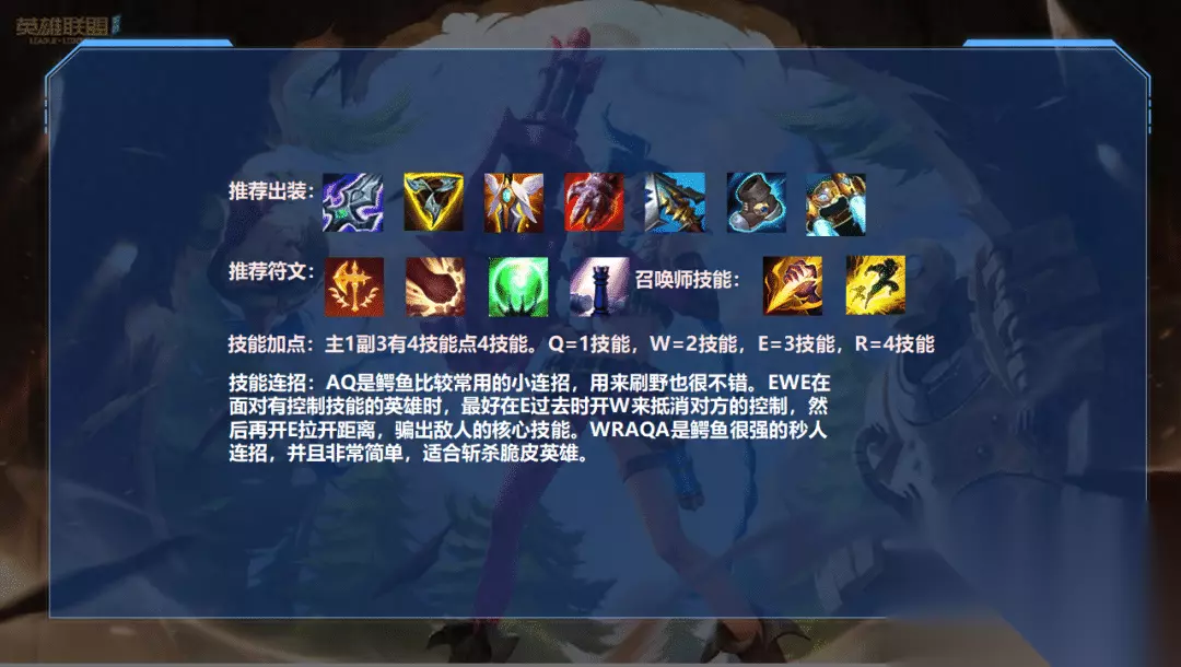 出装方面: 鳄鱼如果前中期出肉装的话,爆发就没那么高,一套想要秒杀敌人是非常难的,除非是装备碾压的情况下。鳄鱼大招本身有着相对可观的坦度,那我们干脆直接拉满输出,只要在敌人打出伤害前将其打残或者击杀掉就可以,也就是说我们这个玩法必须要先手,因为没什么坦度,吃不了太多伤害,不适合打反手。 如果敌人的吸血或者治疗效果比较强的话,前期也可以出一个小重伤来过渡,如果不需要重伤,那么最好还是选择怨恨。 附魔推推棒很重要,如果对方的爆发很高,也可以出金身来保命。 推荐天赋: 征服者可以提高鳄鱼的持续输出能力和爆发伤害 残暴可以提高鳄鱼的基础伤害,对方脆皮多可以带凯旋,肉多可以带巨杀 无效化法球也不是固定的,对方控制多也可以带泰坦猎人 战略家可以提高打野控资源的速度技能连招: AQ是鳄鱼比较常用的小连招,用来刷野也很不错。EWE在面对有控制技能的英雄时,最好在E过去时开W来抵消对方的控制,然后再开E拉开距离,骗出敌人的核心技能。WRAQA是鳄鱼很强的秒人连招,并且非常简单,适合斩杀脆皮英雄。