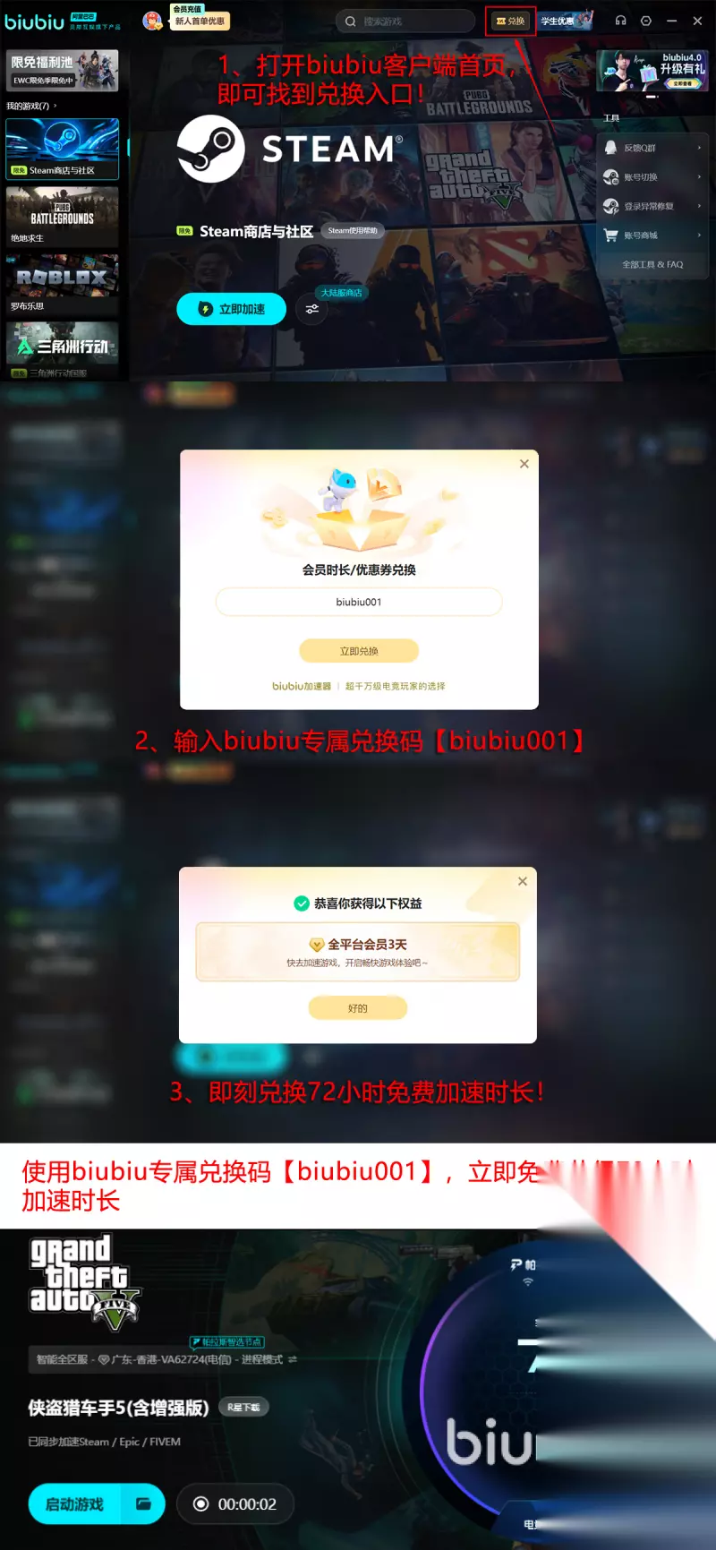给大家带来流畅网络的同时,喜欢玩各种竞技类型的,讲究团队之间共同合作的,也可以避免在最初或者是整个过程当中,因为延迟或者是各种路线拥堵原因,所造成的不能连接网络。早就受到了pubg冠军选手小叮当的极力推荐,由实力雄厚的阿里巴巴灵犀互娱的技术,还有专业团队自研的帕拉斯3.0引擎,极大程度上满足各个网络游戏所出现的延时等问题。如今的新用户,只需注册登录就能够免费加速24小时,新老用户的话可以利用输入兑换口令【biubiu001】的这一种方式,让大家免费有三天的加速时长,最多一共享受96小时。