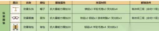 从以上图中不难看出,防雾的道具有三种,分别是头盔,眼镜以及背包了,而这三种道具要解锁的话,也是需要制衣间提高到三级,自宅要有十一级才行。 三、防毒防雾适应地图