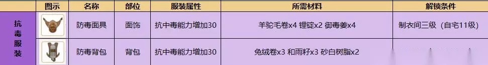 从上图中不难看出,防毒的道具有两个,分别是防毒面具以及背包,而这两个道具的解锁条件是将制衣间的等级提升到三级,也就是自宅达到十一级才可以。 二、防雾解锁