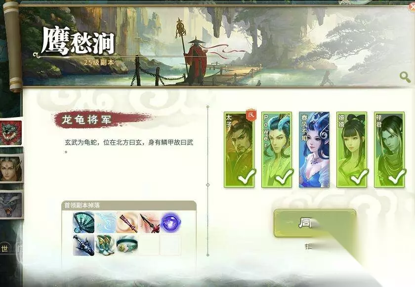推荐配置:凌烟阁(1-2)+花果山(1-2)+任意职业 进入副本后直接回开启第一个BOSS龙龟将军。 龙龟将军: