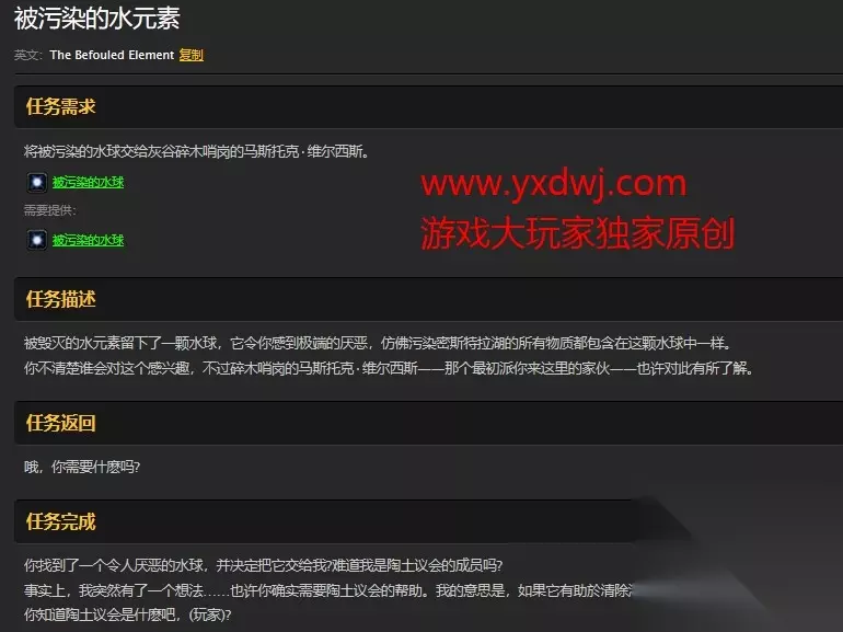 泰雷德斯具体坐标 任务具体要求 玩家在击杀了这个不一样的水元素之后掉落了一颗水球 仿佛湖泊之中的污染物都凝聚在这颗水球之中。 你不知道这玩意应该给谁。 也许你应该给派你来这里做任务的那个人去看看。