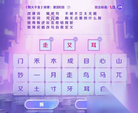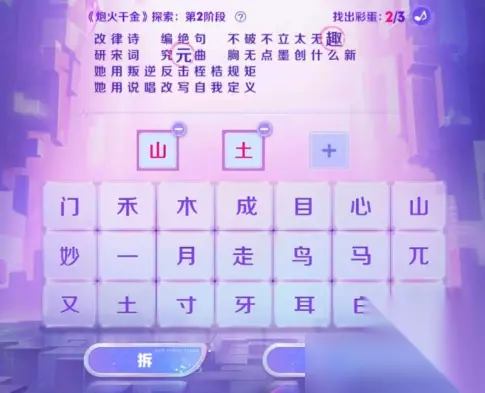 活动时间:2022年8月5日-2022年8月11日 活动位置:游戏界面右侧活动-第一个“因你闪耀”-右上角的“主打歌探索”。 第二阶段答案: 1、兀+一