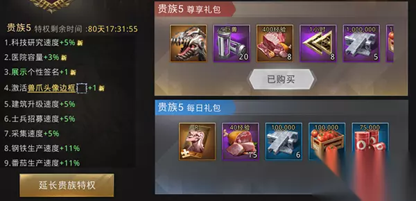 (实际活动奖励以游戏内为准) ==02贵族权益== 【贵族3】建筑速度+5%; 【贵族4】招募速度+5%; 【贵族5】科技速度+5%、橙2暴虐龙; 【贵族6】建筑速度+10%、行军队列+1、免费创建军团; 【贵族7】招募速度+10%、5000积分; 【贵族8】科技速度+10%、10000积分 【贵族9】红色暴虐龙、20000积分 贵族权益重点,可看自己需求消费: