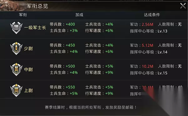 ==08军衔== 对于喜欢SLG的战犯来说这是最大的好处,杀敌数可以获得军衔,军衔有各种加成,带兵数、士兵攻击、士兵生命、行军速度,建议抱团跟着大佬吃肉。