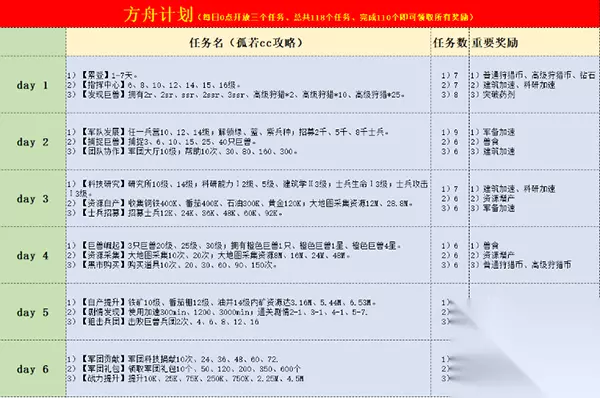 t15_2-t15_1:6.0 标签: 鳄龙 这篇攻略主要讲的是七天活动以及如何合理利用资源,还有巨兽的选择,全篇无尿点无废话。是不可多得的精品攻略哦~ 攻略作者:孤若cc (本文仅代表玩家观点,不代表官方立场) ---------------------- ==01方舟计划== 根据7天活动来合理利用资源。方舟计划是很容易完成的,可以获得钢拳和鳄龙。但是零充和微小氪玩家,需要好好利用资源做铺垫。