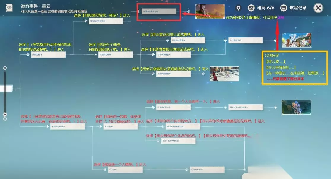 《原神》重云邀约任务全结局流程图攻略 一、邀约成就 1、焉知非福邀约中内正确鉴定全部情报(慧眼识妖,5原石) 2、热力难敌中制作错误的冰棍(辣椒英雄,5原石) 3、完成重云所有邀约结局(诛邪退散,20原石) 一图流: