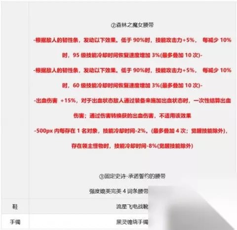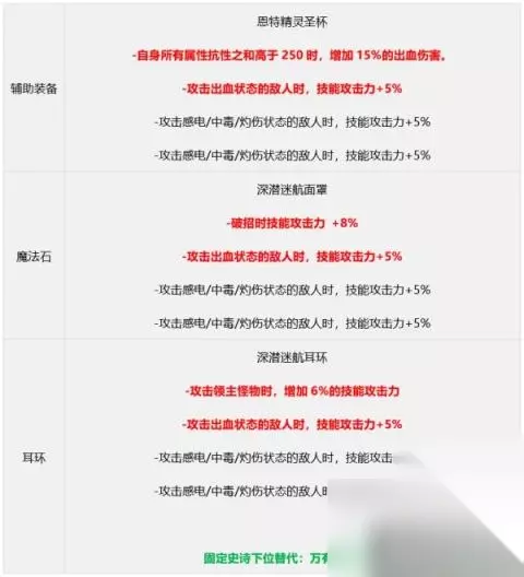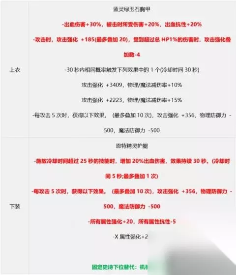 【方案二】九自定义出血流 搭配说明:神界版本次级毕业搭配之一,缺点是三速较低,装备给予的CD较低(但魔皇有CP武器所以问题不大),出血流的脆皮问题也还在; 部分部位在没有自定义之前可用固定史诗过渡,具体请参考下面说明