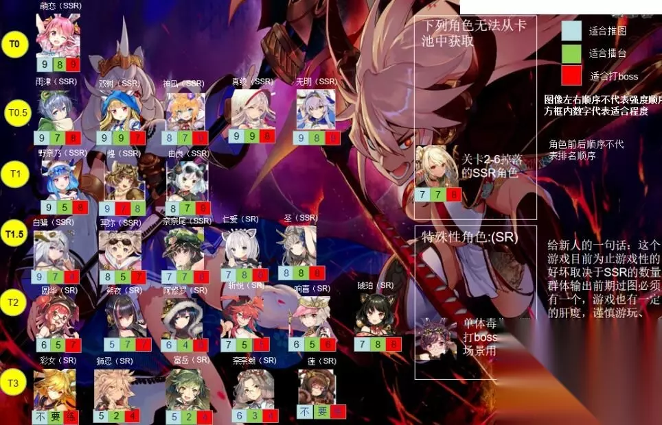 注意 图中蓝色评分对应【推图强度】,绿色评分对应【打擂台强度】,红色评分对应【打BOSS强度】。10分是满分,9分是完美的评价,8分是优秀的评价。