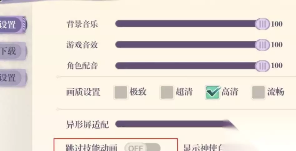 4、进入设置界面,点击标注位置的跳过技能动画。 5、点击OFF按钮即可关闭技能过场动画。