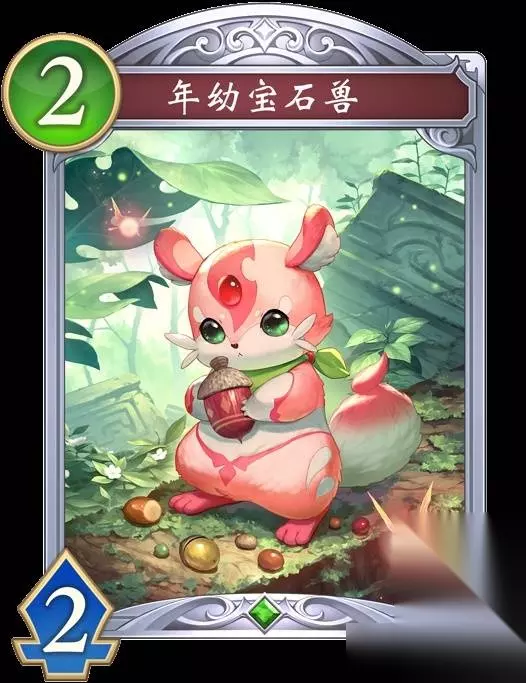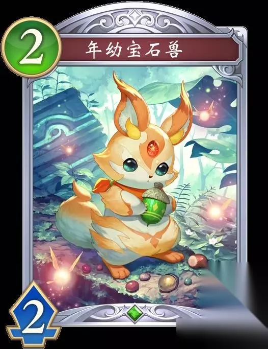 年幼宝石兽 【入场曲】选择自己的战场上的1张其他卡牌,使其返回手牌。 【超进化时】回复自己3点能量点。 进化前 据说这种特殊的宝石兽只会栖息在某片森林里,众多研究者尝试过要解开其生态之谜却无功而返。 然而有个男人认为自己与众不同,开始了研究。 他的热情如同宝石兽额上的红宝石一般熊熊燃烧。