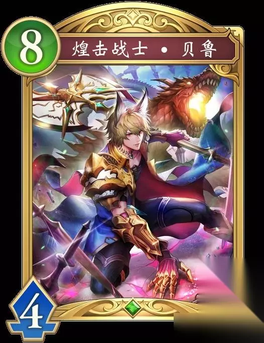煌击战士·贝鲁 在手牌中发动。自己的随从离开战场时,使本卡牌的费用-1。 【入场曲】选择对手的战场上的1个随从,对其造成4点伤害。 进化前 曾经,有一场救世之战。 有个奇迹,不屈服于巨大的黑暗,为世间夺回光明。 不依赖于一个人的光芒,而是汇聚众人的光辉——人们称其为煌闪骑士团。