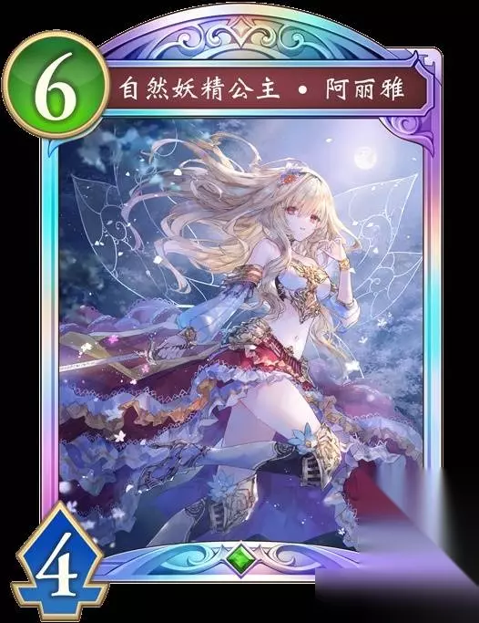自然妖精公主·阿丽雅 【入场曲】使自己获得『纹章:自然妖精公主·阿丽雅』。 【超进化时】召唤3个『妖精』。 纹章:自己的妖精·随从进入战场时,使其获得【疾驰】。 进化前 风和树告诉我,新的战斗正要来临。 既然如此,我会毫不犹豫地再次拿起剑。 即使邪恶的枝叶遮蔽了光芒、无论黑夜多么深邃…… 我知道,温柔的月光终将照进夜晚的森林。