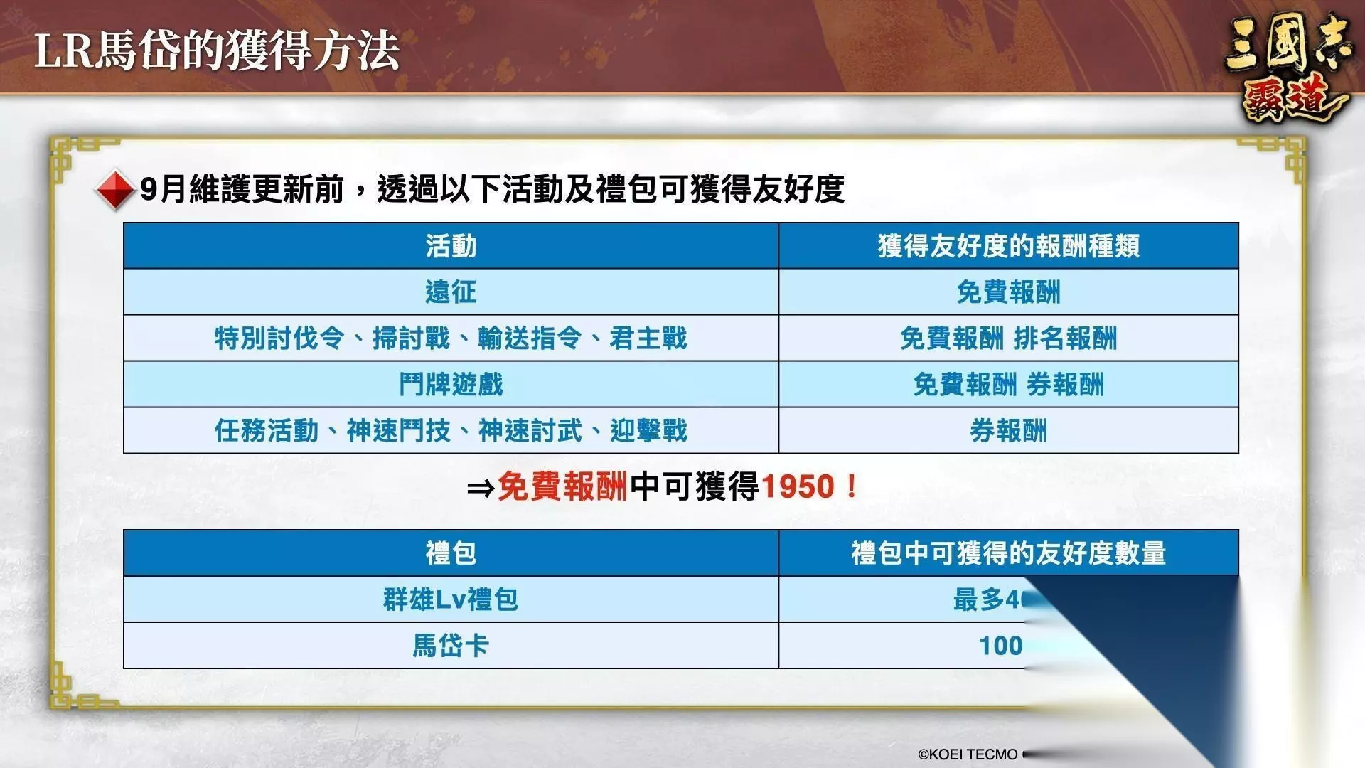 《三国志霸道》LR马岱获取方法 一、LR马岱怎么获取 在2025年9月更新维护前通过活动或礼包累计一定的友好度后即可解锁 二、友好度获取方法 ①参与指定活动获取 参与远征、特别讨伐令、输送指令、君主战和斗牌游戏等活动 ②购买礼包获得 购买群雄Lv礼包和马岱卡