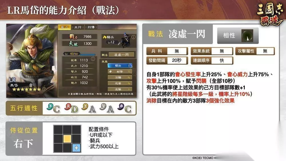 三、LR马岱技能介绍 LR 马岱会作为赛季武将登场 他可以借由有利变化「闪袭」和技能效果使自身部队维持兵力并发挥攻击性。 还可以使用战法犟化自身部队的通常攻击性能,借由会心造成大量伤害的骑兵武将。