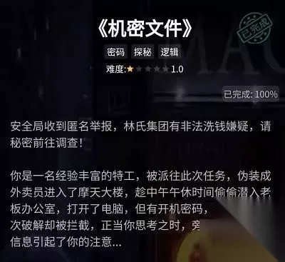 犯罪大师机密文件答案是什么?犯罪大师机密文件正确密码是多少?犯罪大师机密文件案件中我们要根据图示中的线索来解答出正确答案哦,其实这次的答案就是数字密码呢,下面就来告诉给大家具体解答内容吧~ 犯罪大师机密文件正确密码分享 《机密文件》 难度:1.0 奖励经验值:200