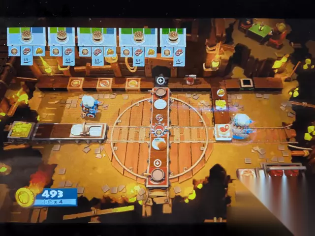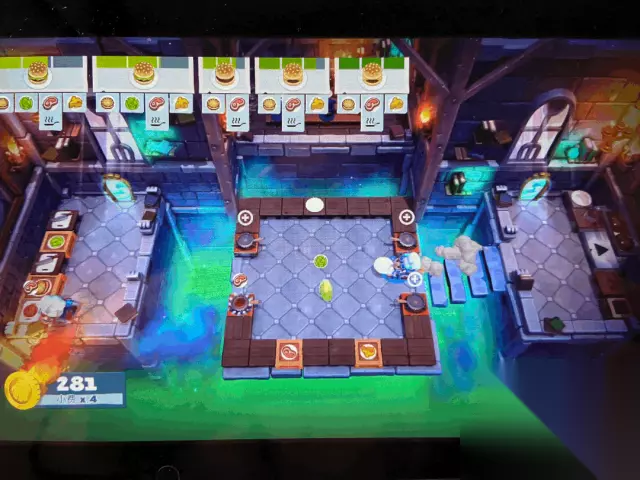 主题二——黄金矿工 该主题下的菜品大多都是快餐以汉堡为主,玩家需要在山洞的震动中提前感应到菜品发生的转动,比如切菜板会和烹饪的锅具发生交换,不及时调整位置就容易烧糊。这里的Tips是如果是两个玩家的话最好两个人分不同区域操作,不要一起切菜之类的避免来不及逃。