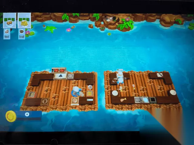 主题三——竹筏 该主题下的菜品大多都是油炸物,像薯条和鸡块这种,玩家需要呆在竹筏上随着浪的转变完成菜品,这里要小心冲刺时候不要掉进水里了。这一主题的Tips是一定两个竹筏至少保证一个人在上面,不然很浪费时间。