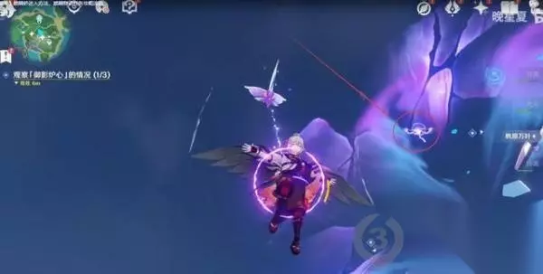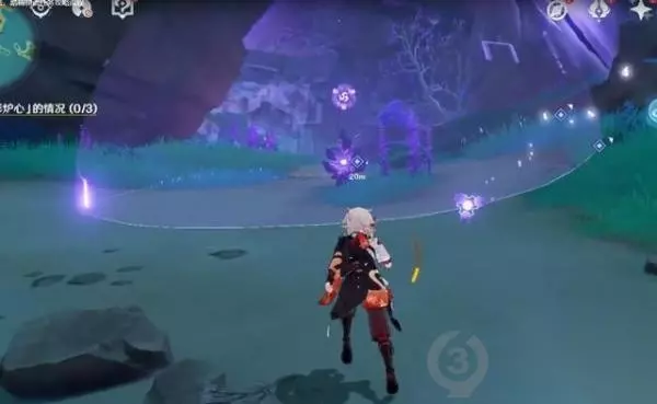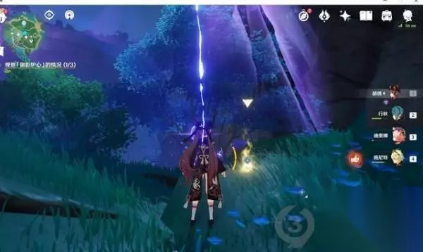 (3)观察三处「御影炉心」的情况。其中,中间这一处的观察需要摸雷灵。 ①在附近拿雷种子穿入雷屏障,点调查完成