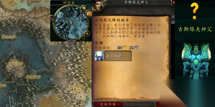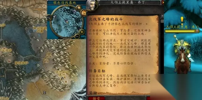 魔兽世界北伐军之峰的战斗任务怎么做 接取等级:77 接取NPC:大领主提里奥·弗丁(冰冠冰川,银色前线基地) 任务需要玩家使用北伐军旗帜后,站在旗帜下有光环,可以大幅提高造成的伤害。 完成NPC:古斯塔夫神父(冰冠冰川,回音谷)