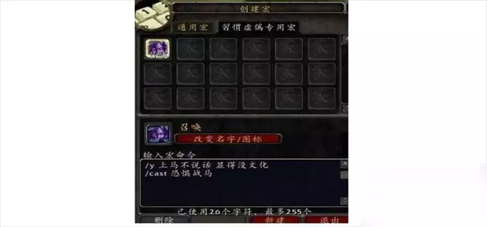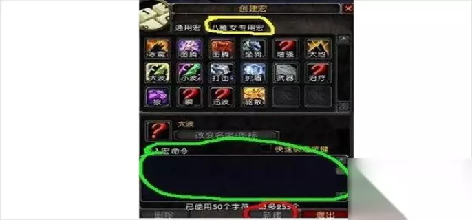 2、如果你就是一个角色,选择哪个都无所谓。然后新建(最下面),选择一个自己喜欢的图标,或者直接选择问号。起个名字。 然后回车,在下面的文本里面输入宏语句。如图所示。